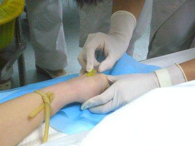 3、选择血管。在穿刺点上方10cm处扎压脉带,按常规进行局部皮肤消毒,待干把以族。