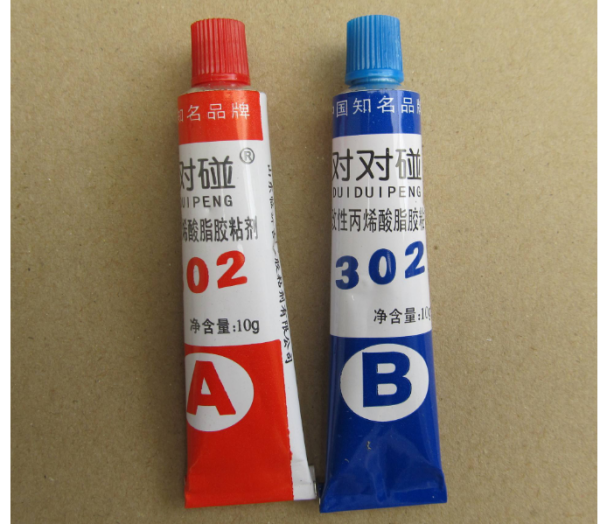 AB胶可以粘金属物质,A是丙烯酸改性环氧或环氧树脂,或含有催化剂及其他助剂,B是改性胺或其他硬化剂,或含有催化剂及其他助剂。