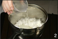 加入水,用筷子稍微搅拌一下,让糖和水混合。开中火加热。之后请不要再搅拌。