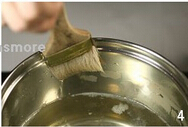 这个时候可能有一部分糖水粘在了锅壁上。为了防止这部分糖产生糖晶颗粒,可以拿一个毛刷沾水,在锅壁上刷一圈。水沿着锅壁流下去的时候可以将锅壁上的糖洗刷到锅里去。