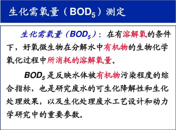 五日生化需氧量即BOD5,就是微生物在最适宜的温度下,一般以20℃作为测定的标准温度。20℃时在BOD的测定条件(氧充足、不搅动)下,一般有机物20天才能够基本完成在第一阶段的氧化分解过程(完成过程的99%)。就是说,测定第一阶段的生化需氧量,需要20天,这在实际工作中是难以做到的。为此又规定一个标准时间,一般以5日作为测定BOD的标准时间,因而称之为五日生化需氧量,以BOD5表示之。BOD5约为BOD20的70%左右。
