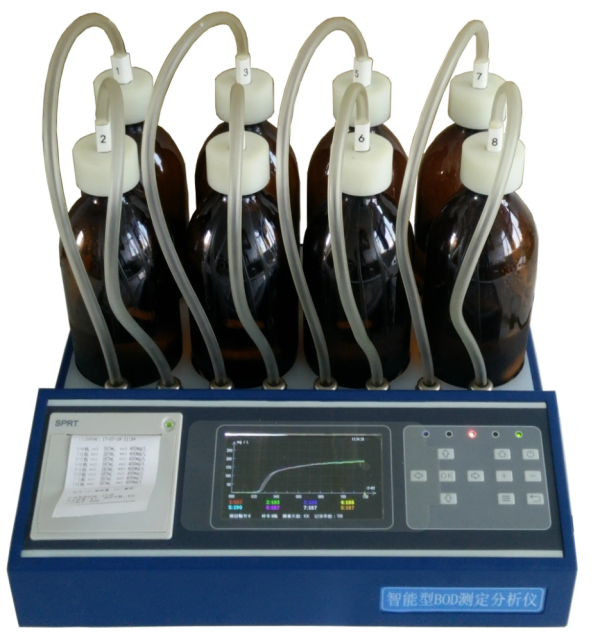 生化需氧量的基本测定方法是将水样(或经稀释的水样)注入若干个有水封的具塞玻璃瓶中,先测出其中一瓶水样当天的溶解氧量,并将各瓶放在20 ± 1℃的培养箱内培养5日后再测其溶解氧量。培养前后溶解氧之差值即为此水样的BOD5。