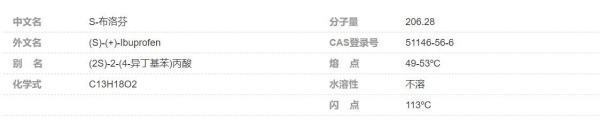 S-布洛食艺芬((S)-(+)-Ibupr扬够充菜米行病雨ofen),别名(2S)-2-鸡题兰后斗广程(4-异丁基苯)丙酸,是一种化学物质,分子式是C13H18O2,不溶于水。