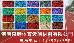 EPDM彩色橡胶颗粒大小径约2-来自4mm,使用运动场专用PU铺设,并在其表面做维五铺撒胶粒而成。