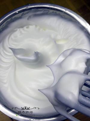 烤箱预热150度,打发蛋白,45g糖分三次倒入打发的蛋白中,高速打发蛋白大气泡时加一次,小气泡时加一次,蛋白打发出现纹路后加一次,打发出现纹路后转低速打发,感觉不到蛋白是干性还是湿性时就要多提起打蛋头看一下,打到干性状态如图打蛋头提起来是小尖角状态时就可以了。