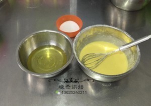 分离蛋白和蛋黄,我用的后蛋法即蛋黄糊中鸡蛋最后加入,这样搅拌好的蛋黄例误保传糊无颗粒,很细腻。