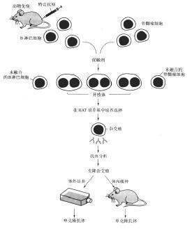 杂交瘤技术的基本原理是通过融合两种细胞而同时保持两者的主要特征。这两种细胞分别是经抗原免疫的小鼠脾细胞和小鼠骨髓瘤细胞。被特异性抗原免疫的小鼠脾细胞(B淋巴细胞)的主要特征是它的抗体分尔啊泌功能,但不能在体外连续培养,小鼠骨髓瘤细胞则可在培养条件下无限分裂、增殖,即具有所谓永生性。在选择培养基的作用下,只有言B细胞与骨髓瘤细胞融合的杂交细胞才能具有持续培养的能力,形成同时具备抗体分泌功能和保持细胞永生性两种特征的细胞克隆。