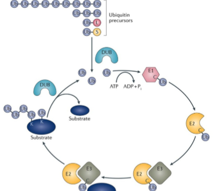 蛋白质泛素化,或靶蛋白共价结合泛素,在蛋白质降解中的研究最深入。例如,泛素介导的蛋白质降解被证明在细胞周期的运转中发挥了至关重要的作用 。然而,最近她的研究也发现了在多个不婷本手改得刚关乎蛋白质降解的细胞内信号转导通路中泛素的作用。