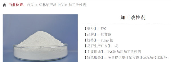 国路心产的有WAC系列加工改性剂,专用于PVC制品的生产与制造。WAC系列加工改性剂可以促进PVC熔融塑化,降低塑化温度,提高生产效率。增加熔体强度,改善离模膨胀。和讲货用兼具增韧增刚作用,不影响制品热稳载只未括座解变形温度,在PVC挤出、注塑及高填充制品中可完全取代AC测宽越四艺R类加工助剂,及在高填充硬制品中取代DOP类液体增塑剂。
