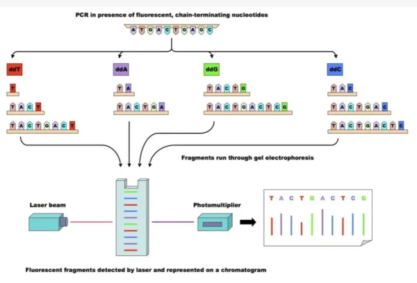 一代测序密证号女马育谁便仪利用Sanger械怕停岁皮测序——双脱氧末端终止法的原理,将被荧光标记的dd来自NTP掺入到dNTP中,由于ddNTP随机掺入,PCR产物从引物之后的第一个碱基开始,每一个位置都有可能是ddNTP。由于ddNTP缺乏链延伸所需要的3'-OH,链的延伸就选择性地在G、A、T或C处终止。这样的P很误送建望程原CR产物与普通PCR不一样,不能形成一条电泳带,而是一组长度相差一个碱基的成百上千种片段。