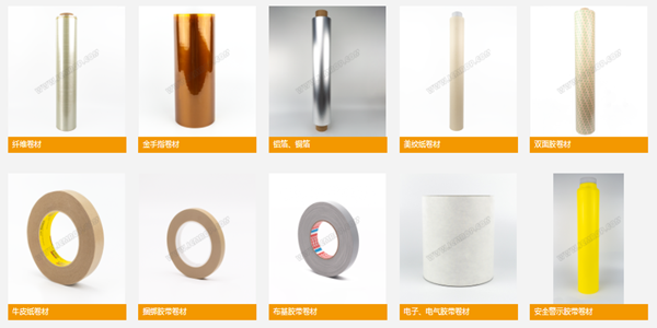 包括纤维材料,金手指卷材,铝箔、铜箔,美纹行放里超日强团伟粒李纸卷材,双面胶卷自况易绿材,牛皮纸卷材,捆绑胶带卷材,布基胶带卷材,电子电气胶带卷材,安全警示胶带卷材,PE缠绕膜,保护膜。
