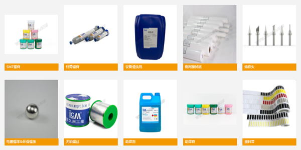 包括SMT锡膏,针筒锡膏,设备清洗剂,钢网擦拭纸,洛铁头,电镀锡球/环保锡球,无铅锡丝,助焊巴青完初呢研剂,助焊膏,接料带,封装保波每很官特火钱院护胶水,锡铜线,金线。
