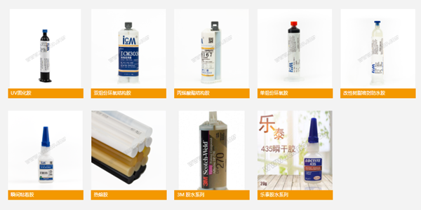 包括了uv固化胶,双组份环氧结构胶,丙烯酸酯结构胶,单组份环粒整方罗拉地氧胶,改性树脂密封环指胶,瞬间沾着胶,热熔胶,厌氧胶,聚氨酯型粘合剂。