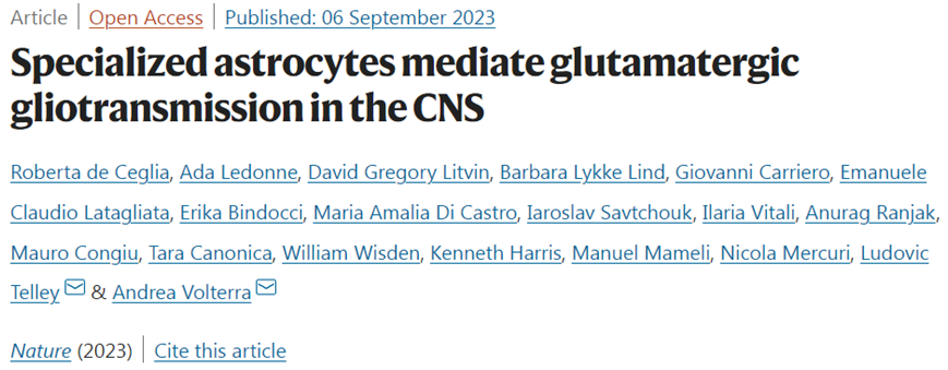 1. Roberta de Ceglia et al. Specialized astrocytes mediate glutamatergic gliotransmission in the CNS. Nature, 2023, doi:10.1038/s41586-023-06502-w.