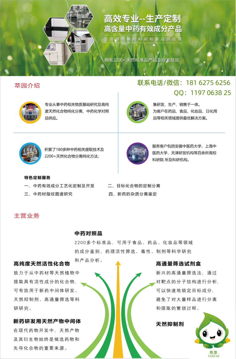 湖北萃园生物科技有限公司是一家集研发、生产、销售于一体的国际性高技术企业,主要从事高纯度中药化学成分、中药对照品、高品质提取物、天然产物中间体以及药物杂质等的生产、定制和生产工艺开发。专注于天然产物在医药,食品,日化等大健康领域的开发和应用以及中药物质基础研究和中药质量标准国际化;服务于全球科研机构、高校和各种终端客户。