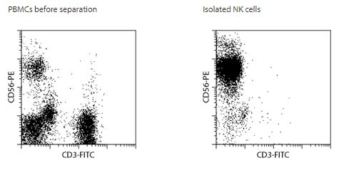 用于从人PBMC分离NK细胞, 非NK细胞,即T细胞,B细胞,干细胞,树突状细胞,单核细胞,粒细胞和类红细胞,通过使用生物素结合抗体的磁珠分离NK细胞,去除磁性标记后可获得高纯度的NK细胞。
