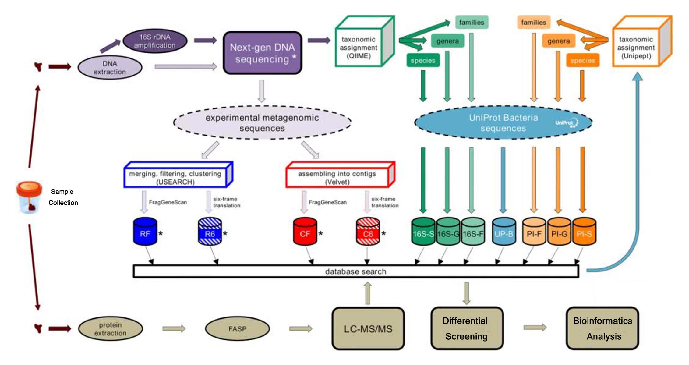 宏蛋白组学是应用蛋白组学技术对微生物群落进行研究的一项新技术,在特定时间对微生物群落的所有蛋白组的组成进行大规模的鉴定。所研究种类非常多样化,比如活性淤泥中的微生物,海洋微生物,土壤中的微生物,发酵食品中的微生物,肠道微生物,粪便、黏膜腔等。 宏蛋白质组分析的基础来自于宏基因组测序的精确结果,其数据库来源主要通过两种手段:通过16s测序得到大体物种组成后在公共数据库中提取相应物种序列数据库进行整合;通过全基因组/转录组测序等手段深度测序样品中的DNA/转录组信息。 技术优势 ▶可获得样品中不同物种来源的全部蛋白质信息; ▶可进行样品中微生物群落的组成和功能分析,揭示微生物与环境之间的相互关系。 应用领域 ▶生物医药:肠道菌群与重大疾病关系研究; ▶微生物领域:致病机理,耐药机制,病原体-宿主相互作用研究等; ▶临床诊断:生物标志物,疾病机理机制,疾病分型,精准医疗等。 实验流程 数据分析 参考文献 1. Enteric dysbiosis is associated with sepsis in patients. FASEB J. 2019. 宏蛋白质组学_粪便_脓毒症与肠道微生态的关联研究 2. Integrated Meta-omics Approaches To Understand the Microbiome of Spontaneous Fermentation of Traditional Chinese Pu-erh Tea. APPL ENVIRON MICROB. 2019. 宏蛋白质组学_茶叶_普洱茶自然发酵过程中微生物组的变化研究 3. An integrated metagenomic/metaproteomic investigation of microbiota in dajiang-meju, a traditional fermented soybean product in Northeast China. FOOD RES INT. 2018. 宏蛋白质组学_黄豆饼_黄豆饼中微生物组的组成研究