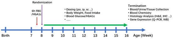 实验内容:瘦素受体缺失的BKS-db小鼠在4-8周龄时会表现出高血糖和高胰岛素血症等II型糖尿病症状。利用BKS-db II型糖尿病小鼠模型检测受试药物对糖尿病的治疗效果。HFD配合低剂量STZ注射C57BL/6J小鼠也可构建II型糖尿病疾病模型用于测试受试药物的药效。