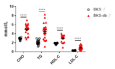 8周龄BKS-db小鼠血液中血脂四项(甘油三酯、胆固醇、低密度脂蛋白胆固醇和高密度脂蛋白胆固醇)水平显著高于对照。数据以Mean±SEM展示,n=20。使用unpaired two-tailed Student's t-test方法进行统计学分析。****,P<0.0001与CD组相比较。