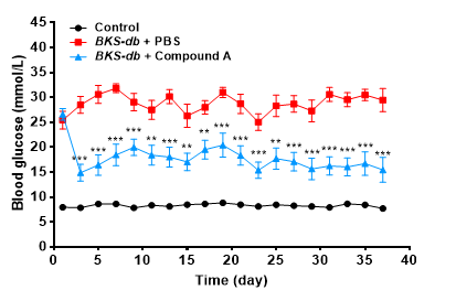 在受试药物干预下BKS-db糖尿病小鼠的血糖明显降低。Control组n=14,BKS-db + PBS组n=12,BKS-db + Compound A组n=12。 数据以Mean ± SEM形式呈现,使用one-way ANOVA with Dunnett post-hoc test方法进行统计学分析。 **, P<0.01; ***,P<0.001与BKS-db + PBS组相比较。