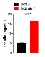 8周龄BKS-db小鼠血液中胰岛素水平显著高于对照小鼠,数据以Mean±SEM展示,n=5~6。使用unpaired two-tailed Student's t-test方法进行统计学分析。****,P<0.0001与CD组相比较。