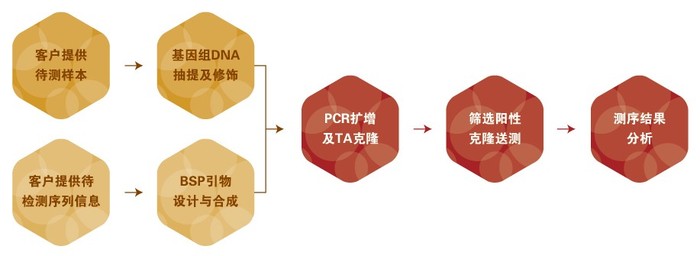 2)BSP引物设计:我们对每个区段设计一到两对引物,引物位置需尽可能的避开DNA中的CG位点,必要时需设计巢式引物,以扩增得到目标片段;