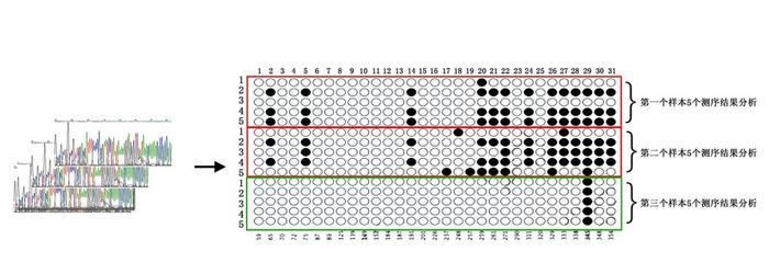 注:图中有三个样本,每个样本含5个克隆测序结果,共计15个测序结果。每个圆圈代表一个CG位点,黑圈代表甲基化,白圈代表未甲基化;每一行代表一个样本TA克隆的一个测序结果,序列中所有的CG位点情况可被被罗列,此例序列中共含有31个CG位点。