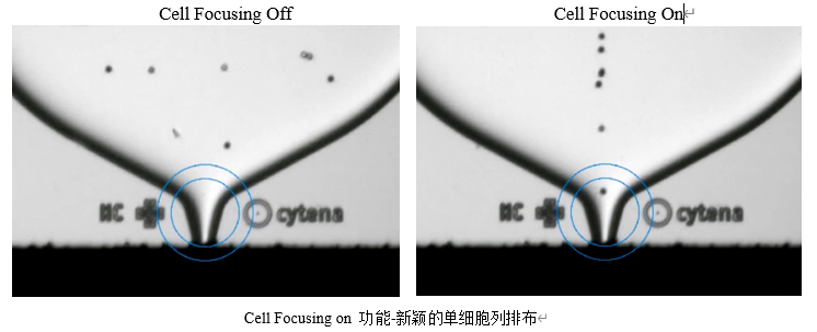 Cytena的单细胞打印机使用专利液滴分配技术,通过高清摄像系统可以在获取单细胞的前提下对获得的单细胞进行进一步形态学上的分析和筛选,同时对单细胞进行接种前的拍照。UP.SIGHT在单细胞分离阶段,延续先前高效分析分离技术的基础上,新增加了Cell Focusing功能,在分选过程中,开启此功能可以将正要通过喷嘴的细胞轻柔的集中在中间位置,看起来就像细胞被排成了一列,顺次通过一样,这样在处理稀有类型细胞时,能够减少细胞的丢失率,并且能够更好的对细胞进行形态学上的分析,还能够提高分选速度!