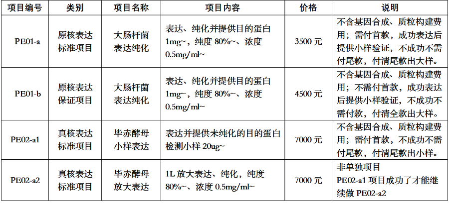 目前我们可提供大肠杆菌原核表达和毕赤酵母真核表达&标准类型和保证类型等多种蛋白表达纯化服务项目: