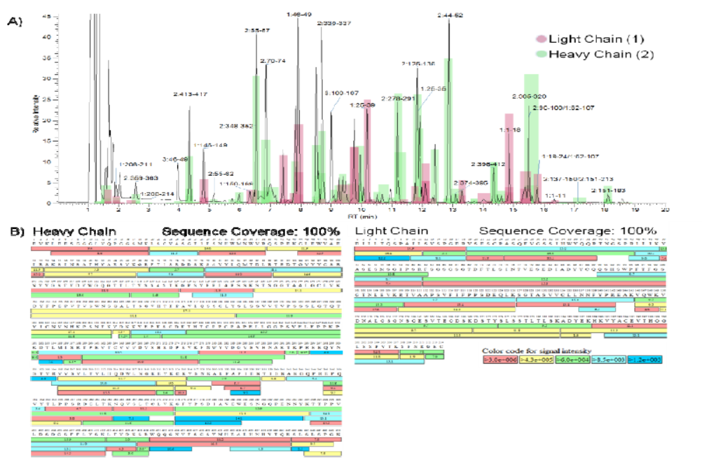 肽段覆盖率是确认序列正确与否的关键项。蛋白先经过蛋白酶酶解,经过反相色谱柱进行分离,经过