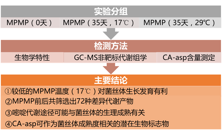 白灵菇的生物特征结果表明较低的MPMP温度(17℃)对其生长发育有利。采用基于GC-MS的非靶标代谢方法来比较在MPMP第0天、第35天(17℃和29℃)菌丝体中代谢产物的丰度,鉴定出236种差异代谢产物,根据VIP大于1和p <0.01的标准选择出72种差异代谢产物(上调37.8%,下调62.2%)。这些代谢物主要参与糖酵解、有机酸代谢、氨基酸代谢、TCA循环、糖代谢、烟酸酯和烟酰胺代谢以及氧化磷酸化。嘧啶代谢途径可能与菌丝体的生理成熟有关,参与该途径的代谢产物CA-asp的含量在MPMP第35天显著增强,是菌丝体成熟的潜在指标。作者证明了CA-asp在不同MPMP阶段收集菌丝体中的含量呈规律性变化,这表明CA-asp可用作菌丝体成熟指标的可行性,但该指标是否可用于商业生产需经大规模验证。