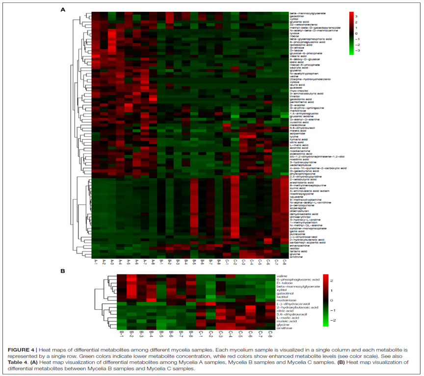 在菌丝体A,B和C样品的热图中观察到了差异代谢物明显的动态变化(图4A)。图4A的上部显示了与菌丝体A样品相比,菌丝体B和菌丝体C样品中丰度明显降低的代谢物,而图4A的下部显示了与菌丝体A样品,例如CA-asp、甘氨酸、乳糖醇、酒石酸、内酰胺、角鲨烯、6-甲基巯基嘌呤、5-甲氧基色胺、天冬酰胺、没食子酸和烟酰甘氨酸。图4B显示了与菌丝体B样品相比菌丝体C样品中的差异代谢产物。与菌丝体C样品相比,菌丝体B样品中丰度显著增加的代谢物包括缬氨酸、6-磷酸葡萄糖酸、D-塔洛糖、β-甘露糖基甘油酸酯、木糖醇、半乳糖醇、乳糖醇和麦芽三糖。而(-)-二氢香芹酚、2-羟基、柠檬酸、5,6-二氢尿嘧啶、L-苹果酸、马来酸、甘氨酸和鸟氨酸的丰度显著降低。