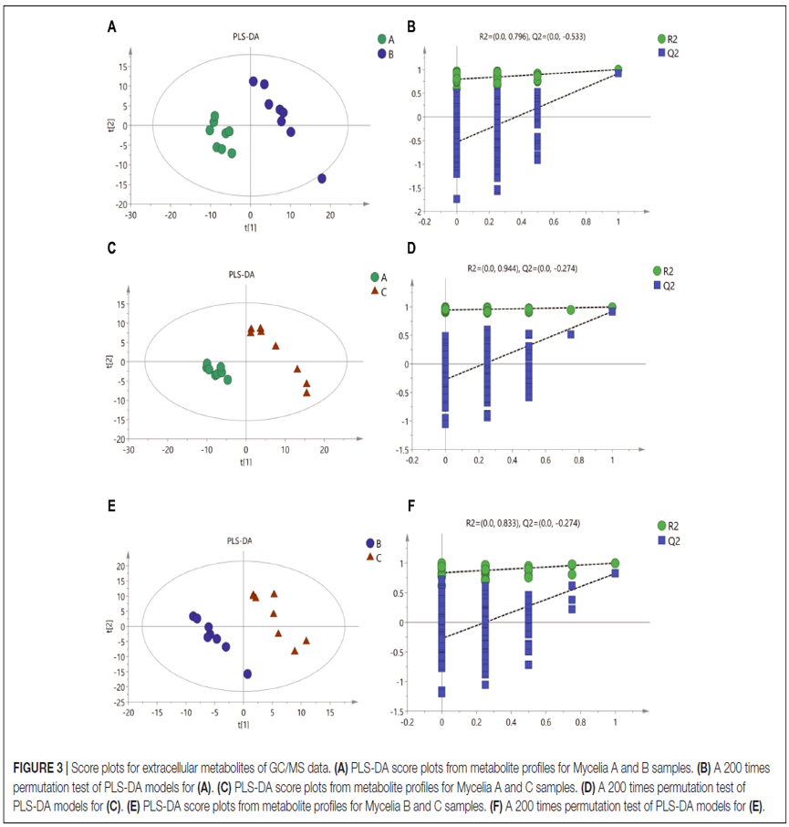 有监督PLS-DA模型显示,菌丝体A,B和C样品之间存在明显代谢差异(图3A,C,E)。PLS-DA模型的拟合度和预测能力均比较可信(表3),并未过拟合(图3B,D,F)。