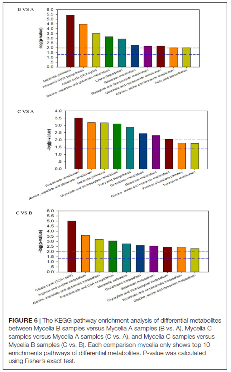 B vs. A菌丝体B与A样品,C vs. A菌丝体C与A样品,C vs. B菌丝体C与B样品。每组比较的菌丝体仅显示前10个差异代谢物的富集途径。P值使用Fisher精确检验计算得出的