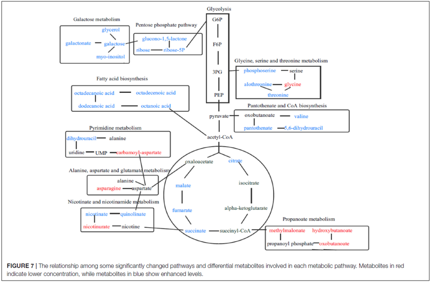 图7显示了每种代谢途径中涉及的一些显著改变的途径和差异代谢物。