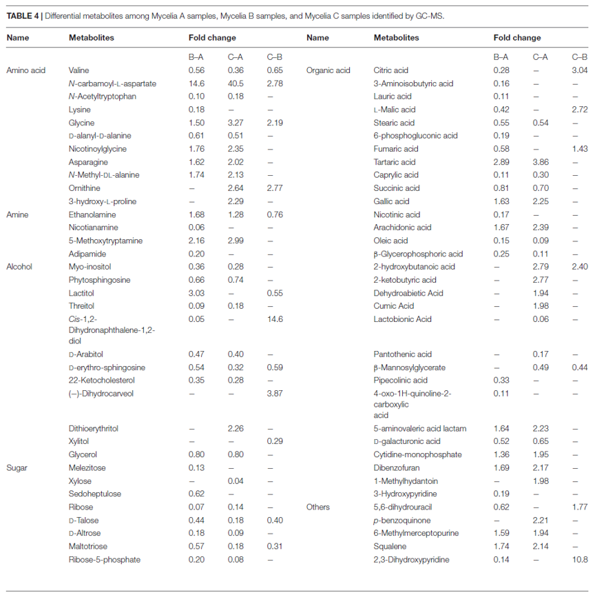 表4 通过GC-MS鉴定的菌丝体A,B和C样品之间的差异代谢物