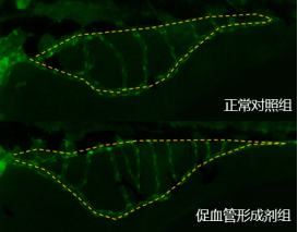 我们将受测试斑马鱼分成二组,分别是正常对照组和服用促血管形成剂组。其中正常对照组不做任何处理。服用促血管形成剂组加入毛蕊异黄酮之类的促血管形成剂。服用药物一段时间后在荧光显微镜下分析斑马鱼肠下血管面积。