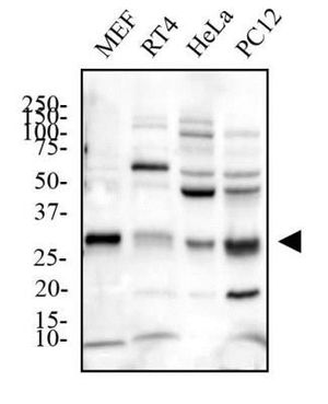 WB analysis of MEF, RT4, HeLa, and PC12 cell lysate using GTX10880 PHD3 antibody.