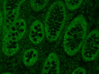 | 产品图片 | ![]() Paraformaldehyde-fixed, paraffin embedded (Human colon cancer); Antigen retrieval by boiling in sodium citrate buffer (pH6.0) for 15min; Block endogenous peroxidase by 3% hydrogen peroxide for 20 minutes; Blocking buffer (normal goat serum) at 37°C for 30min; Antibody incubation with (Cytokeratin 8) Monoclonal Antibody, Unconjugated (bsm-33061M) at 1:400 overnight at 4°C, followed by a conjugated Goat Anti-Mouse IgG antibody (bs-0296G-FITC) for 90 minutes, and DAPI for nuclei staining. |