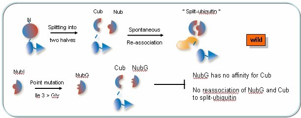 首先,人为地将泛素 Nub 的 3 位异亮氨酸突变为甘氨酸(NubI 突变为 NubG)。 这样与 Cub 的亲合力大大降低,避免了 Cub 和 Nub 自我结合或接近的可能性;。