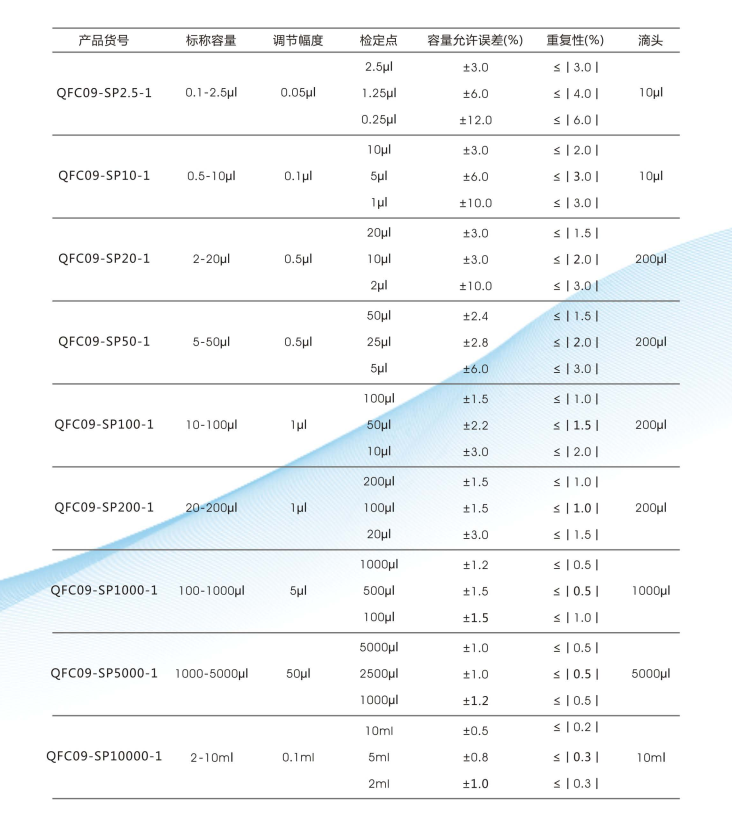 | QFC09-SP5000-1 | 1000-5000μl | 50μl | 5000μl 2500μl 1000μl | ±1.0 ±1.0 ±1.2 | ≤10.51 ≤10.51 ≤10.51 | 5000μl |