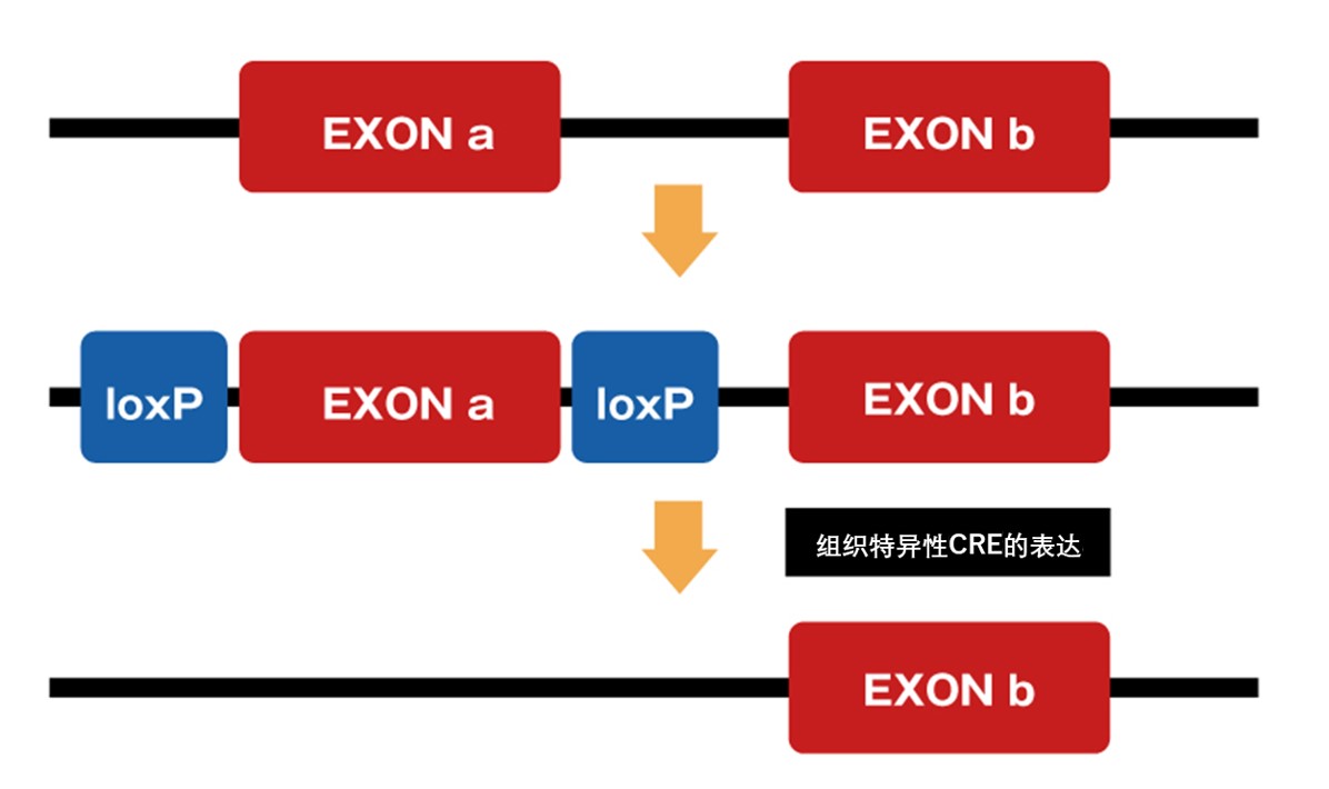 在瞄准的外显子的上游与下游插入loxP序列。与Cre驱动(Cre-driver)小鼠杂交,诱导组织特异性基因破坏(敲除组织特异性基因)。