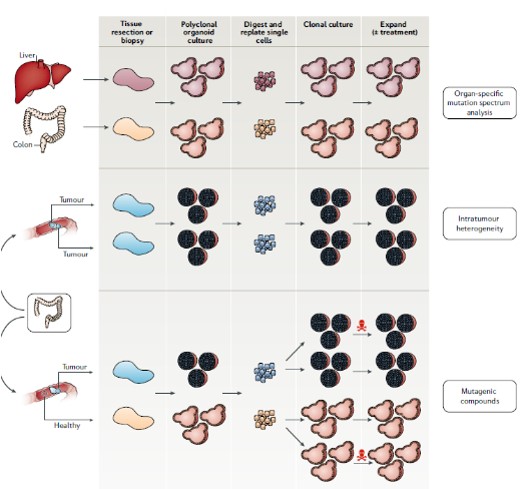 来自不同健康器官的类器官的生长,然后对培养物进行全基因组测序,可以分析器官特异性突变谱。通过生长来自同一肿瘤不同区域的类器官,可以用于研究肿瘤内异质性。区域特异性突变谱可以通过类器官的全基因组测序来揭示。使用与上述相似的方法,可以利用类器官来研究特定化合物对健康细胞和肿瘤细胞突变谱的影响。