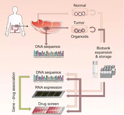 从结直肠癌患者的健康组织和肿瘤组织中提取的三维有机组织培养物被用于高通量药物筛选,以确定可能促进个性化治疗的基因药物相关性。