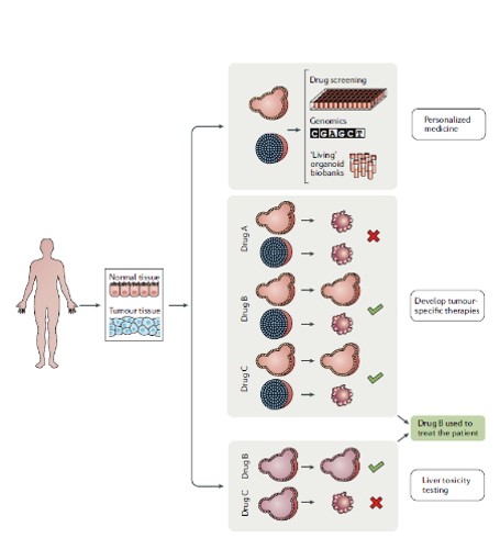 可以从患者来源的健康和肿瘤组织样品中建立类器官。与此同时类器官培养物可用于药物筛选,这可将肿瘤的遗传背景与药物反应相关联。来自同一患者健康组织的类器官的建立提供了通过筛选选择性杀死肿瘤细胞而又不损害健康细胞的化合物来开发毒性较小的药物的机会。自我更新的肝细胞类器官培养物可用于测试潜在新药的肝毒性(临床试验中药物失败的原因之一)。在该实施例中,药物B似乎最适合于治疗患者,因为它特异性杀死肿瘤类器官并且不引起肝毒性。