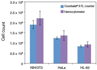 图 1.自动聚焦和先进的算法可以实现更精确的计数。采用 Countess II FL 全自动细胞计数仪(蓝色柱状图)或在显微镜下手动(紫色柱状图)计数NIH/3T3、HeLa 和 HL-60 细胞。每一个柱状图代表 10 次计数的平均值。