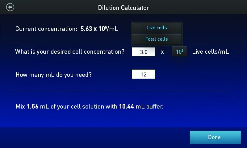 通过内置的稀释计算器,轻松确定您的实验所需的细胞样品及缓冲液的量。计算时自动使用细胞计数结果;可直接输入所需的浓度和体积。