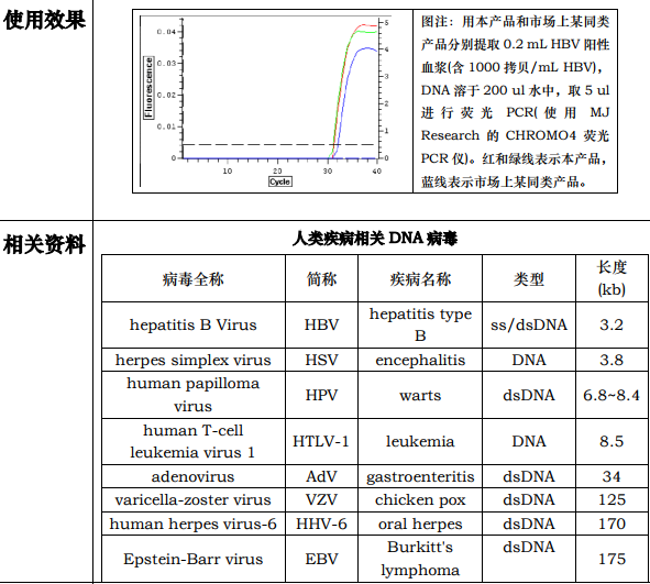 本产品是专门用于从血清(血浆)等液体样品中提取病毒(如HBV)DNA的产品,其原理是异硫酸胍/LiCl溶液即能裂解病毒,又能沉淀DNA。本产品灵敏度高,稳定性好,使用简单快捷,尤其适合于整合到临床PCR检测试剂盒中。