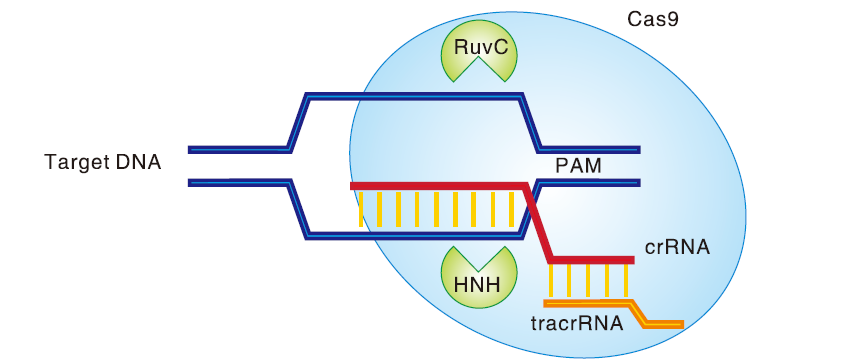 CRISPR/Cas9(Clustered Regularly Interspaced Short Palindromic Repeats)是一种由RNA指导Cas核酸酶对特定基因序列进行DNA修饰的技术。CRISPR/CRISPR-associated(Cas)是细菌和古细菌一种不断进化适应的免疫防御机制。在这系统中,CRISPR对特定DNA的识别是由crRNA或向导RNA通过碱基互补配对,定向寻找目标DNA序列。靶定目标序列后,Cas9蛋白负责对目标DNA进行剪切,造成靶DNA双链断裂。在随后的非同源末端连接修复过程中,断开的DNA双链会由于碱基的随机增减从而以一定的概率实现目标基因功能的缺失。