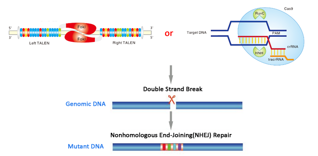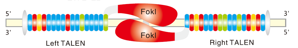 TALE技术(Transcription activator-like effectors)是一种崭新的分子生物学工具。科学家发现,来自植物细菌Xanthomonassp的TAL蛋白的核酸结合域的氨基酸序列与其靶位点的核酸序列有恒定的对应关系。利用TAL的序列模块,可组装成特异结合任意DNA序列的模块化蛋白。TALEN(Transcription activator-like effector(TAL) nucleases)技术是基于TALE与人工改造的核酸内切酶的切割域(FokI)构建针对任意特定核酸靶序列的重组核酸酶。通过TAL的DNA识别域结合到靶位点上,及FokI切割域形成二聚体后,可特异性对目标DNA序列实现切断。在随后的非同源末端连接修复过程中,断开的DNA双链会由于碱基的随机增减从而以一定的概率实现目标基因功能的缺失。